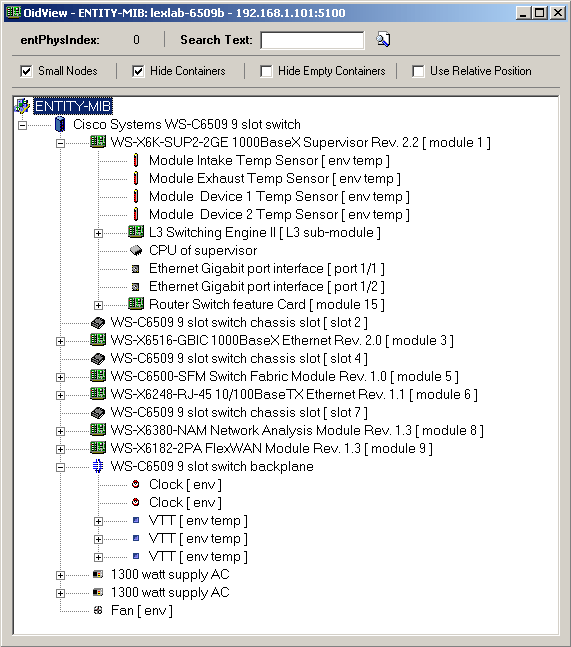 Agents that support the ENTITY-MIB standard can be modeled with OiDViEW's Entity module. In seconds, a full representation of the device is built into a hierarchical tree-like structure. Drill down from the chassis, through the modules, all the way to the ports, CPUs, power supplies, temperature sensors, etc.
