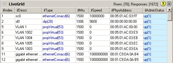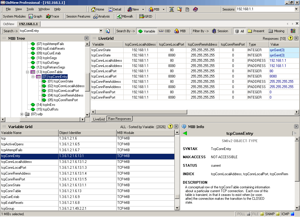 OidView allows advanced grouping on any part of the MIB variable, OID, index, or even the resulting values from the agent. Group up to 3 different things at once for complex result sets. For example, to look at results grouped by tcpConnLocalPort,