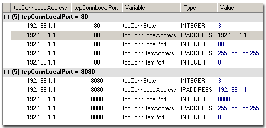 1.3.6.1.2.1.6.13.1.2.192.168.1.1.8080.255.255.255.255.0 IPADDRESS 192.168.1.1