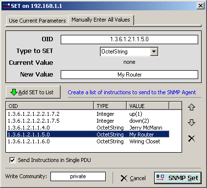 Setting values on agents is a breeze using our SNMP SET Dialog. Send multiple instructions in a single PDU, as well as control the order in which instructions are processed. The BITS type is also supported, allowing the user to select the desired BITS from a simple popup selection box: