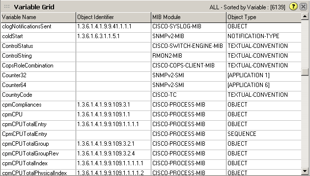 The MIB Variable Grid is visible by default during MIB Browsing.